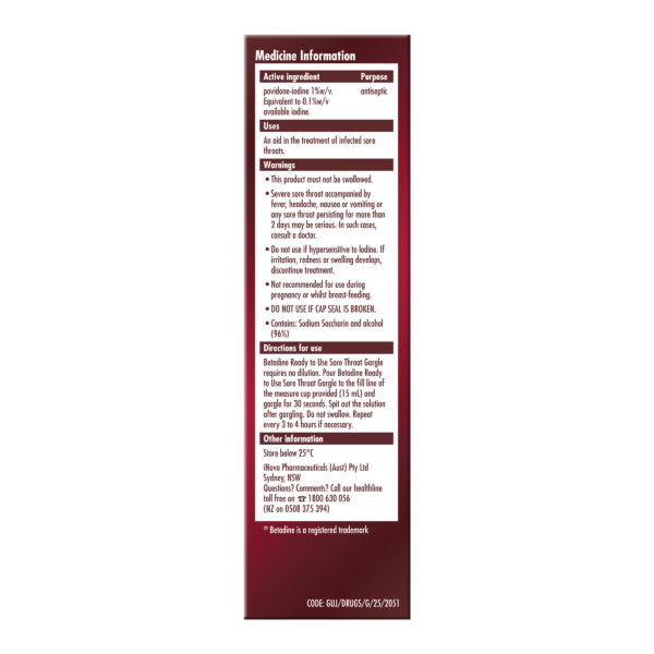 Betadine Ready to Use Sore Throat Gargle is an antibacterial sore throat treatment.