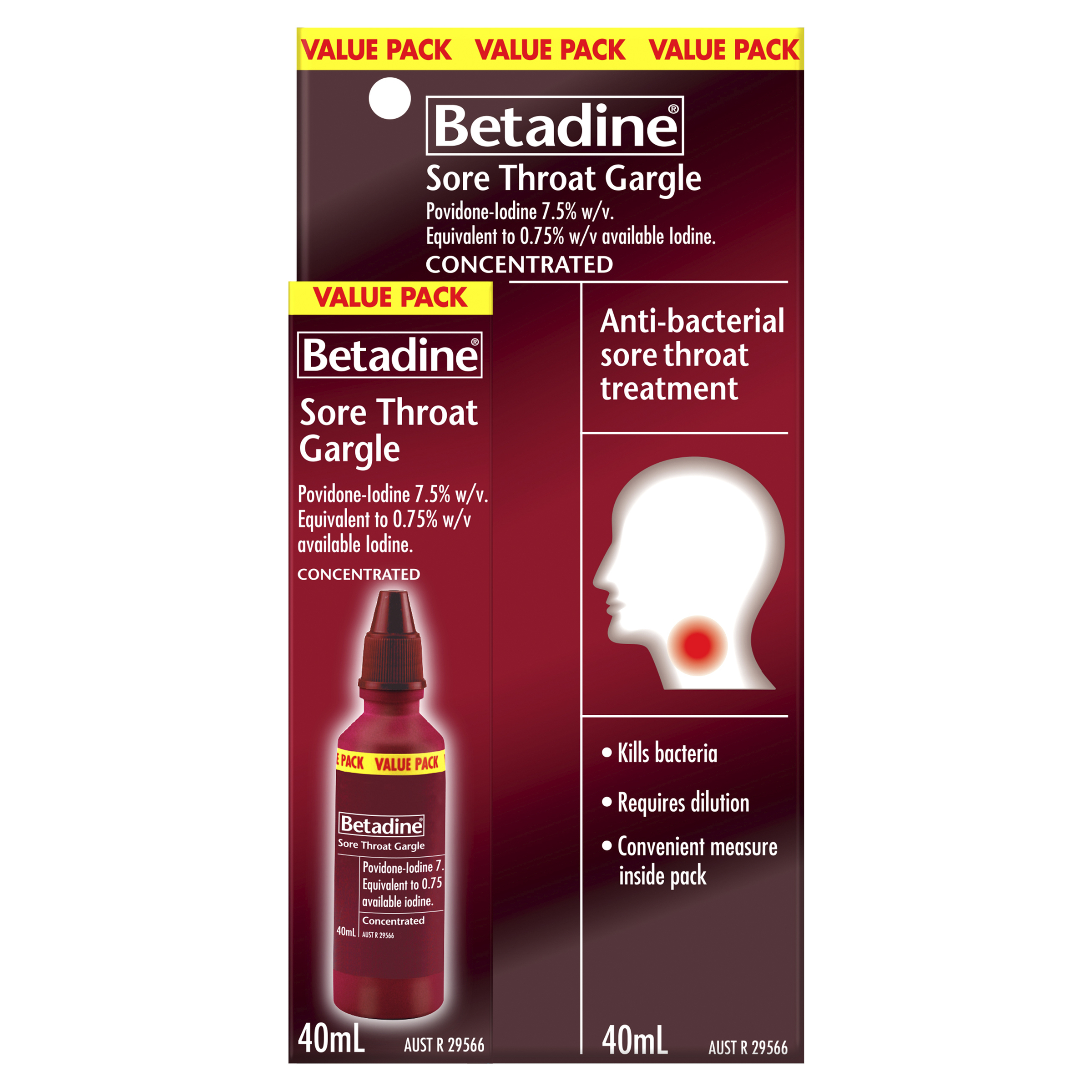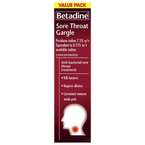 Betadine Sore Throat Gargle is a concentrated antibacterial formula used as an aid in the treatment of sore throats. This gargle must be diluted before use; a convenient measure is included in the pack.