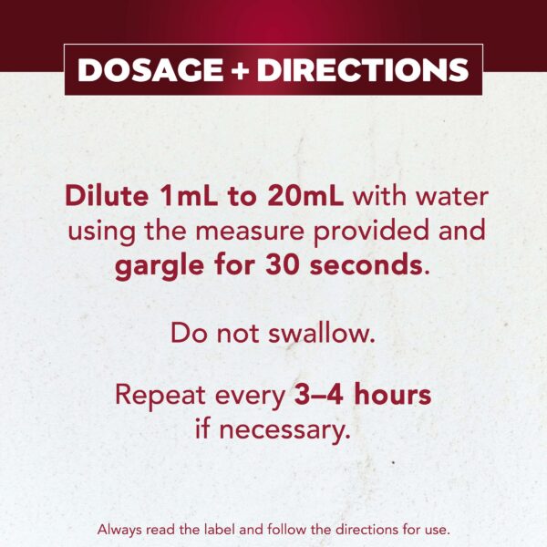 Dilute 1mL to 20mL with water using the measure provided and gargle for 30 seconds. Spit out the solution after gargling. Do not swallow. Repeat every 3-4 hours if necessary.