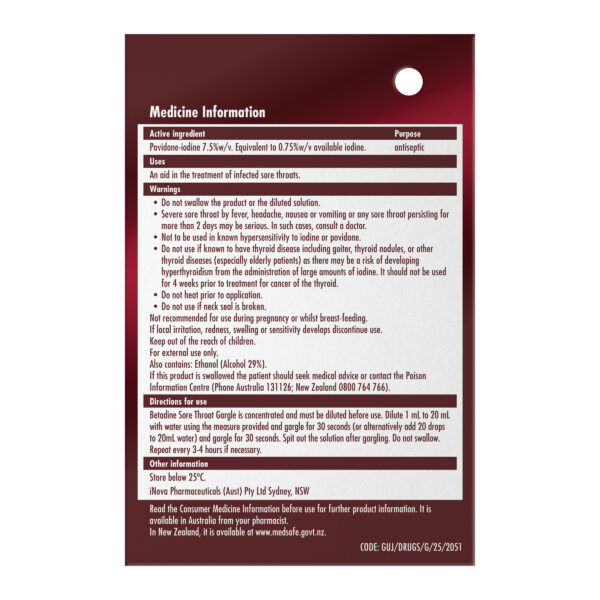 Betadine Sore Throat Gargle is a concentrated antibacterial formula used as an aid in the treatment of sore throats. This gargle must be diluted before use; a convenient measure is included in the pack.