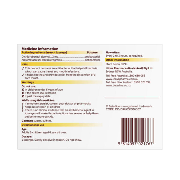 Each lozenge contains 1.2mg Dichlorobenzyl alcohol and 600micrograms Amylmetacresol