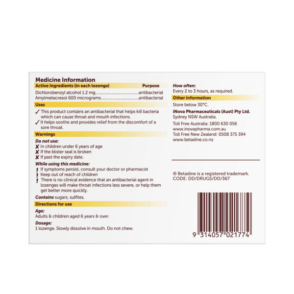 Each lozenge contains 1.2mg Dichlorobenzyl alcohol and 600micrograms Amylmetacresol